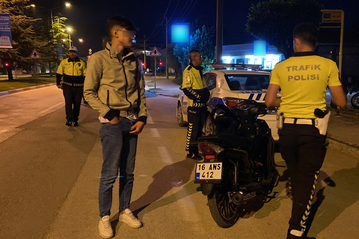 İnegöl Emniyet Müdürlüğü Trafik ekipleri Turgutalp Mahallesi Mimar Sinan Bulvarı üzerinde motosiklet sürücülerine yönelik uygulama yaptı. Uygulamada 16 ANS 412 plakalı motosiklet ekiplerce durduruldu. Yapılan incelemede motosikletin sürücüsü Berat Ö.’nün (16) ehliyetsiz olduğu tespit edildi. Cezai işlem uygulandığı sırada motosiklet sürücüsü Berat Ö., polis ekiplerine ceza yazmamaları konusunda ısrarda bulundu. Ehliyet için başvuru yaptığını söyleyen sürücü, “Benim amcam da polis, arayayım 2 dakika konuşun. Nolur ceza yazmayın” diyerek ısrar etse de, ehliyetsiz araç kullanmaktan 3 bin 674 TL cezai işlem uygulandı.