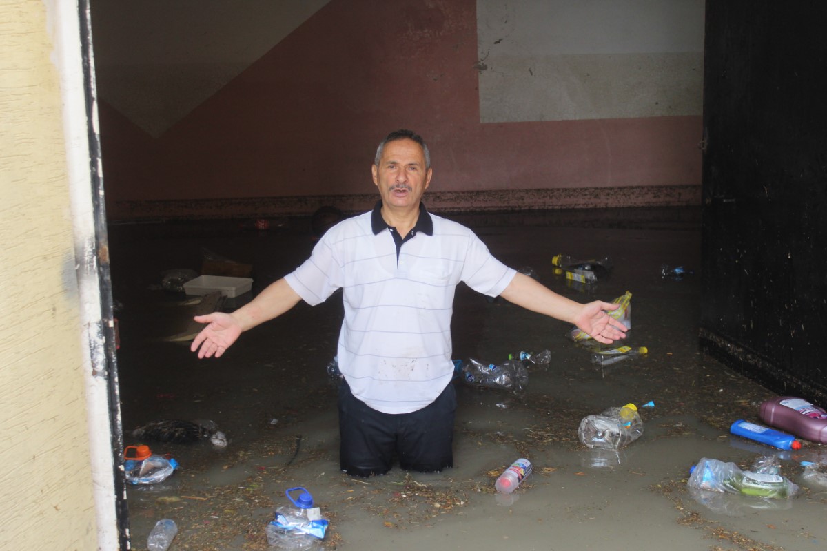 Marketinin deposunu su basan esnaf İsmail Tunç, “Ne belediye, ne itfaiye geliyor. Bu suyun çekilmiş hali. Tavana kadar su geldi. Neyimizi varsa aldı gitti. Yağmur yağdı böyle oldu. İki dakika içinde. İnanılır gibi değil. Araban da yan tarafta. Plakasına kadar gitti. Yani 100 binin üzerinde zararım var. Yalnızca 35 bin liralık sigaram gitti” diye konuştu.