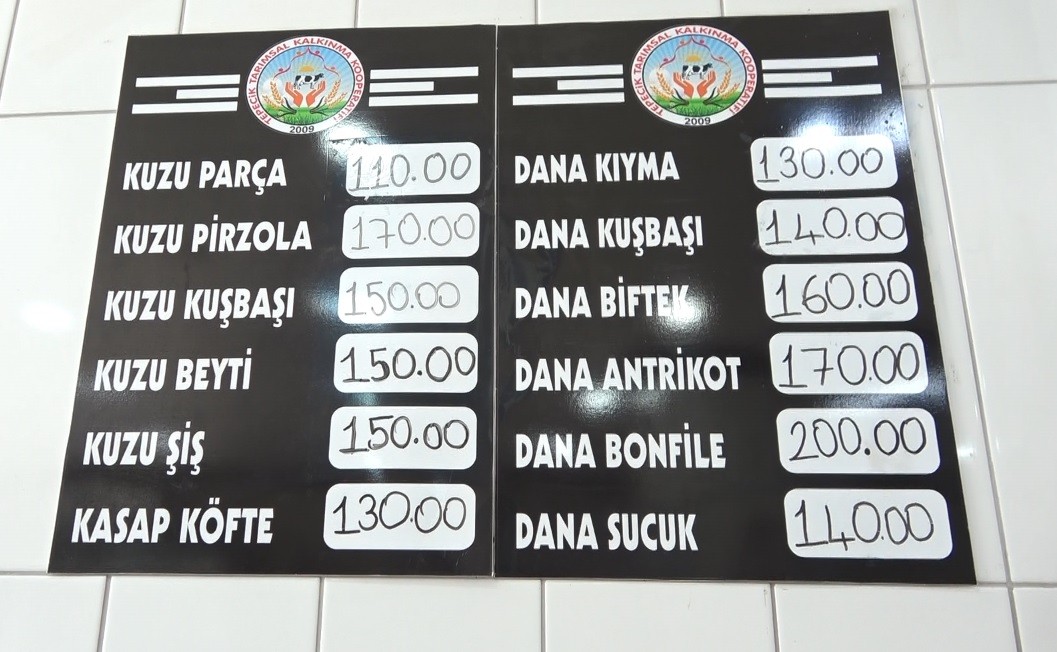 Her geçen gün talep artması sebebiyle köylüler kendi hayvanlarının yanında çevre köylerden aldıkları hayvanları keserek marketlerinde satışını yapıyor. Markette dana kıyma 130 lira, kuşbaşı ise 140 liradan satılıyor. Kuzu kuşbaşı 150 liradan; pirzola ise 170 liradan satışa sunuluyor.