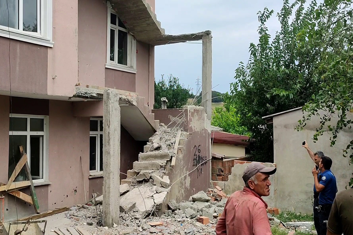 Polis kaza ile ilgili incelemelerde bulunurken, binada yapılan çalışmalar durduruldu.