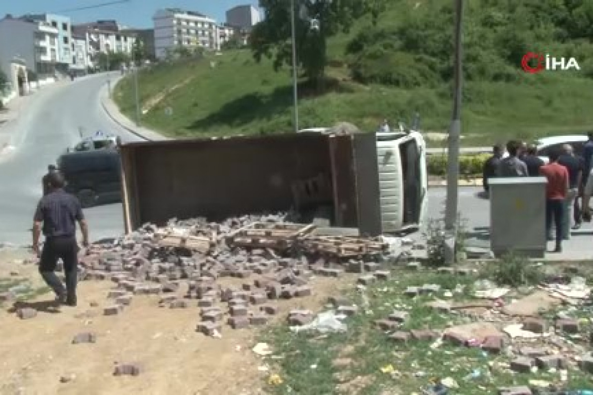 Arnavutköy’de kaldırım taşı yüklü kamyonet yan yattı