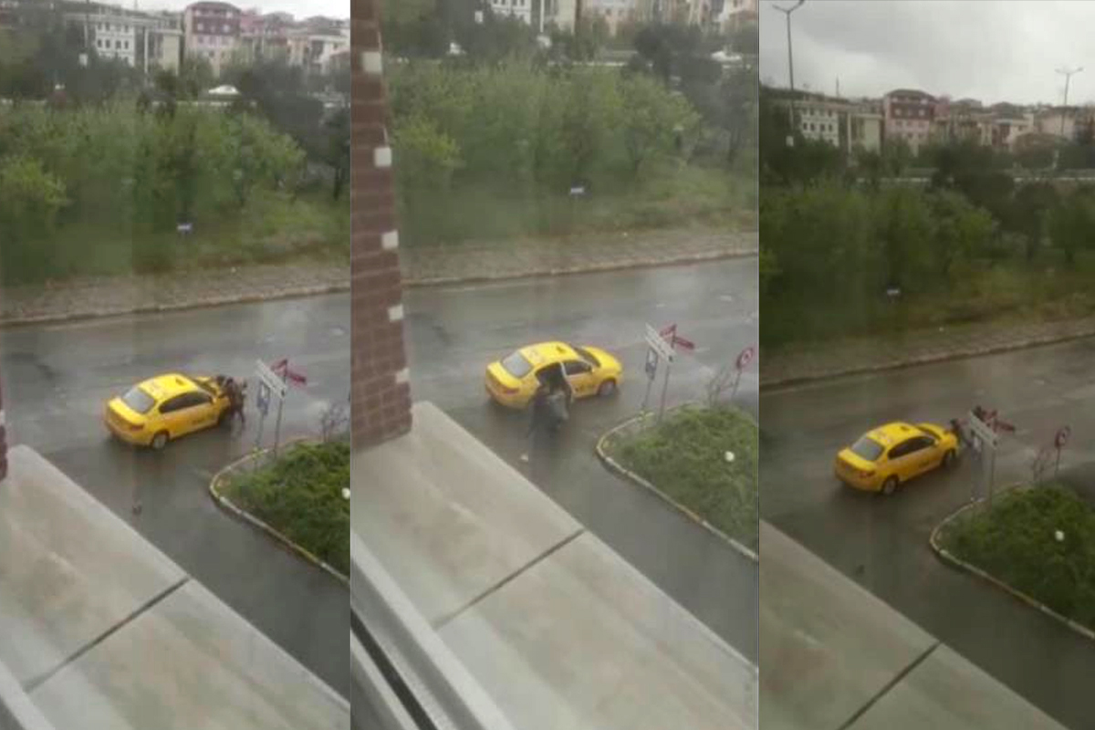 Bu esnada durumu gören bir mahalle sakini de kadının yardımına koştu. Takviye çığlıkları atan kadın, hareket halindeki aracın üzerine çıkarak şoförün gitmesini engellemek istedi. Taksi şoförü aracıyla olay yerinden ayrılırken kadın yolcu yere düştü. Bayan daha sonra Ataşehir Örnek Polis Merkezi’ne giderek şoförden davacı oldu. O anlar bir semt sakini göre cep telefonu kamerasına kaydedildi.
