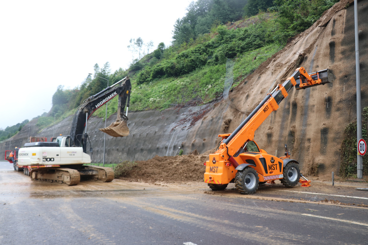 Karayolları ekipleri sabahın erken saatlerinden itibaren yola kayan toprağın kaldırılması için çalışmalarını sürdürüyor.