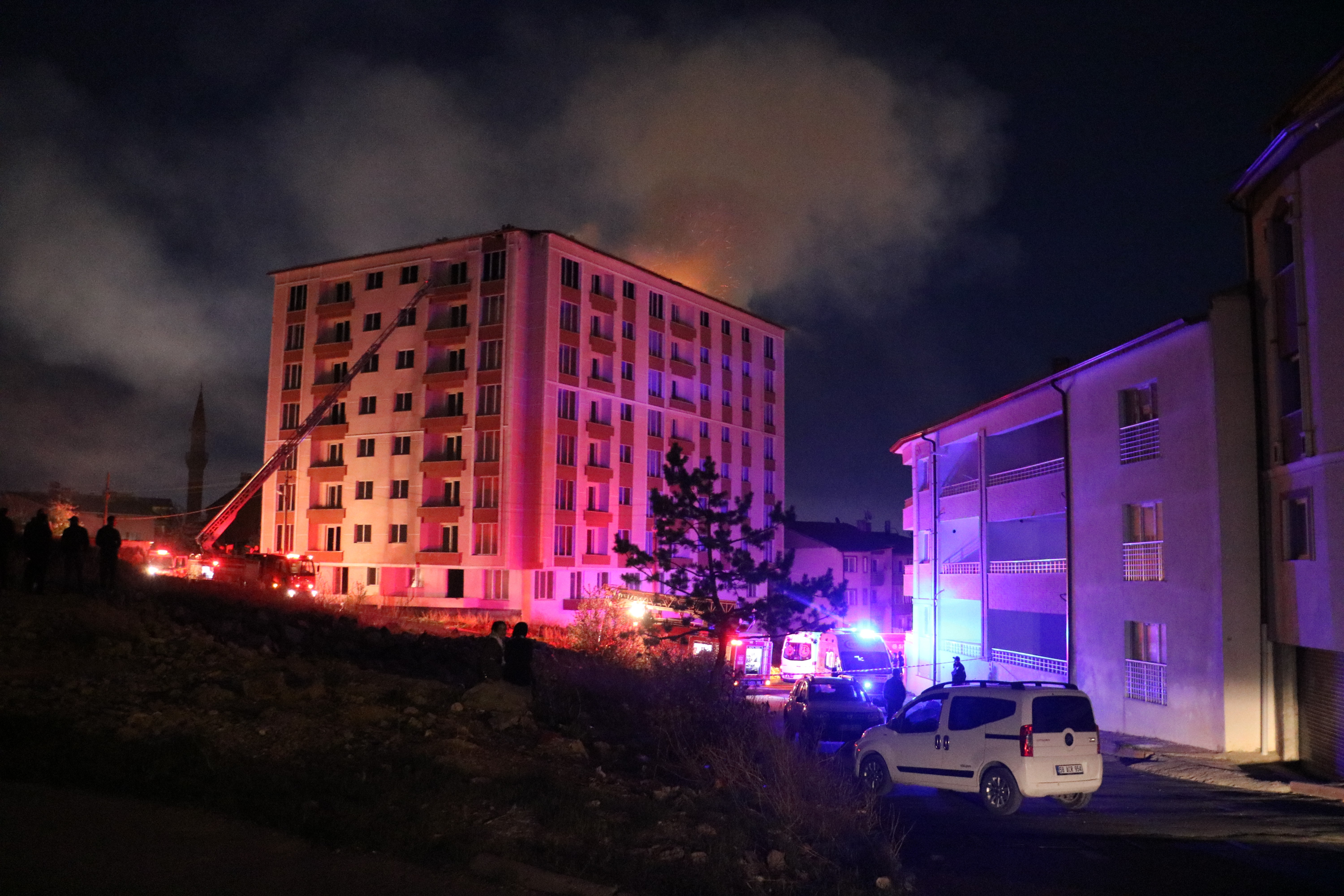 Boş apartmanın çatısı yandı, alevler geceyi aydınlattı