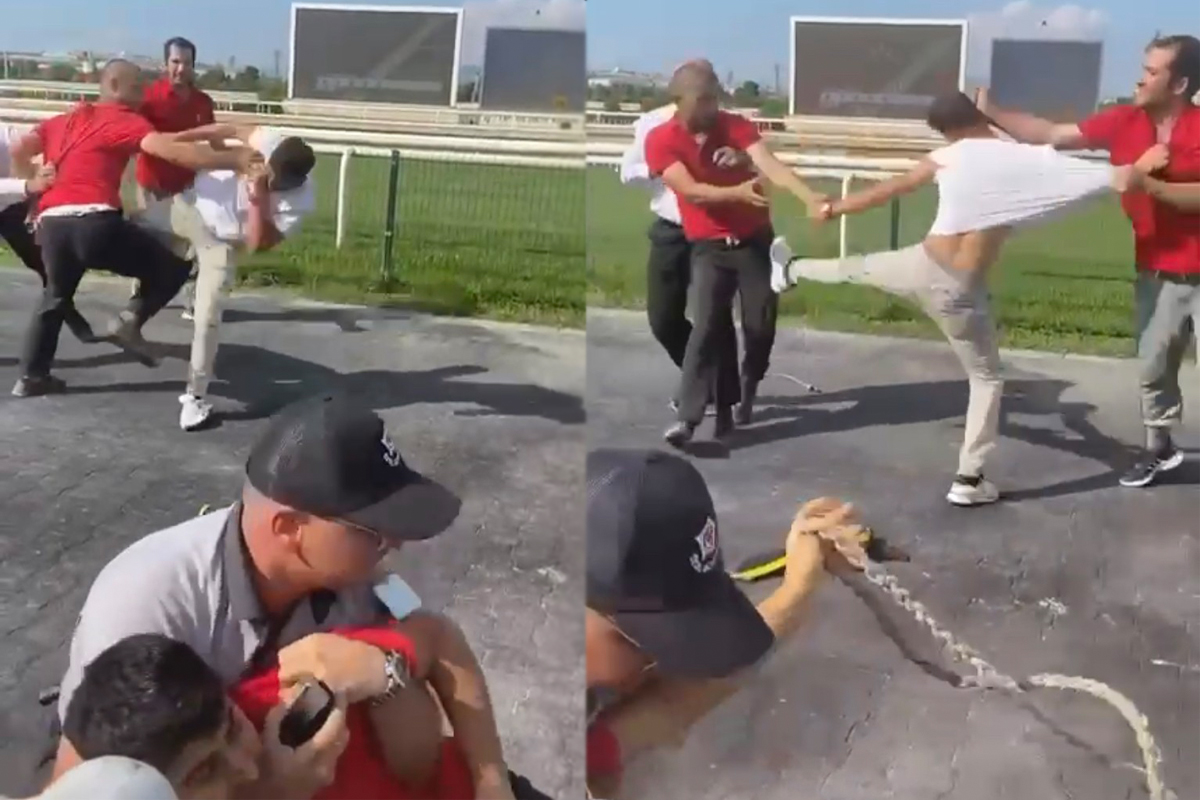 Olay, merkez Nilüfer ilçesi Altınşehir Mahallesi’nde meydana geldi. Edinilen bilgiye göre, at yarışlarının Bursa ayağının yapıldığı hipodromda atları padoğa götürmeye hazırlanan seyislerin arasında henüz bilinmeyen bir sebepten dolayı tartışma çıktı. Tartışma kısa sürede kavgaya dönüşürken seyisler birbirlerine tekme ve tokatlarla saldırdı. Güvenlik görevlilerinin ve yarış severlerin araya girmesiyle kavga son bulurken kavga anı cep telefon kamerasına saniye saniye yansıdı.