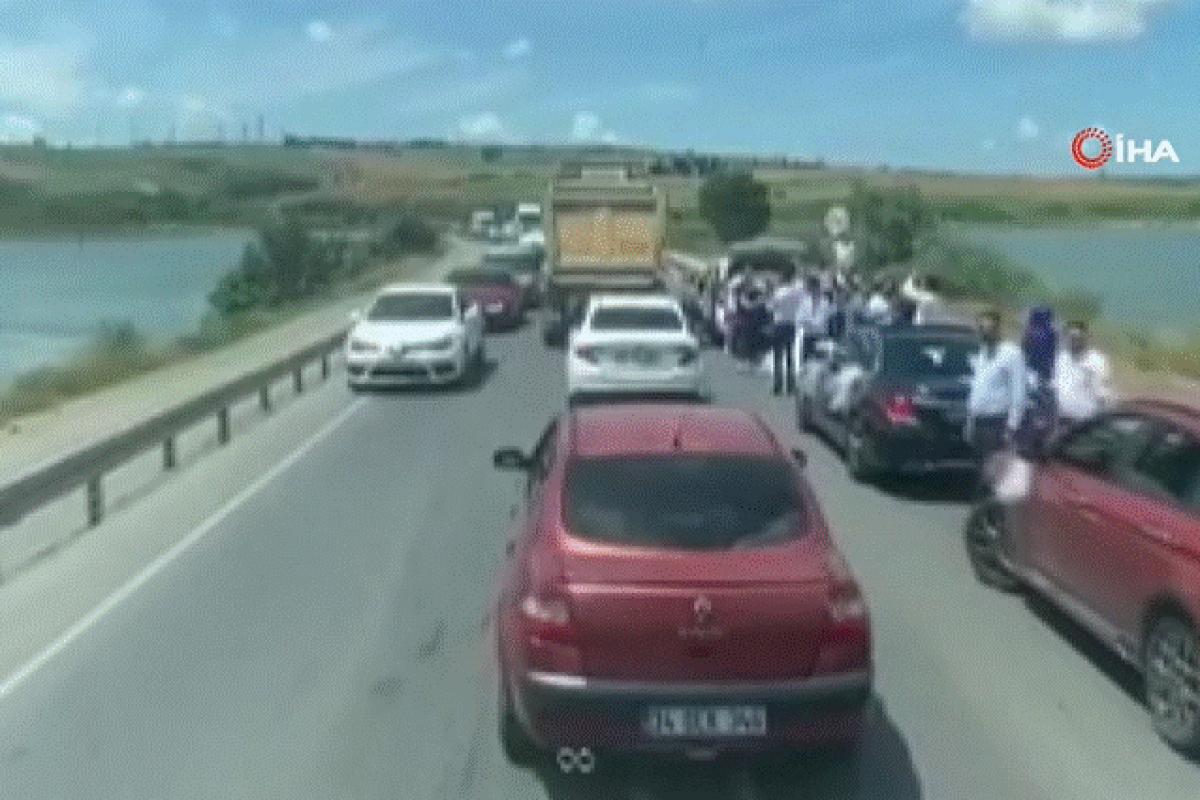 Düğün konvoyunda yolu kapatıp oyun oynadılar, o anlar kamerada