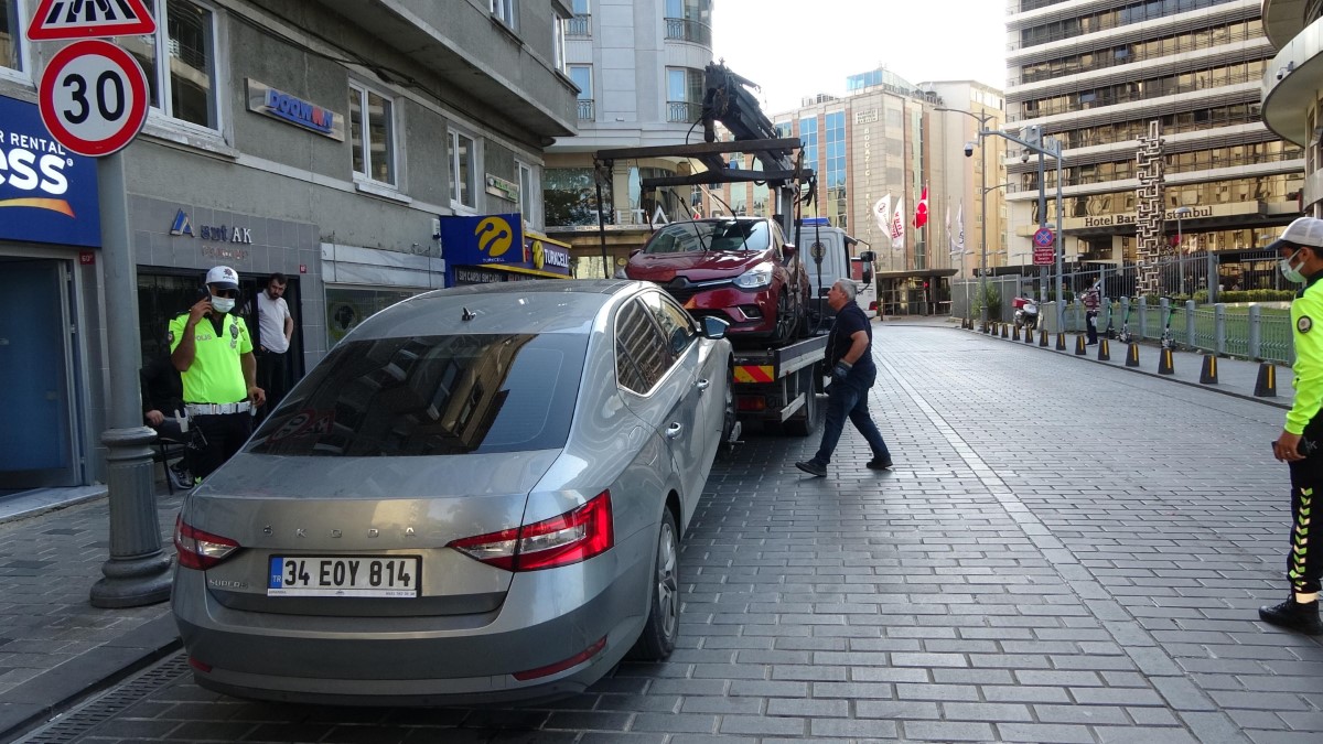 Yabancı turist telefonundan polis memurlarının fotoğraflarını sildi. Otomobil ise bağlanarak otoparka çekildi.