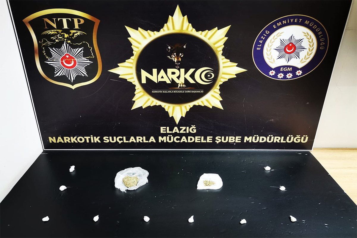 Elazığ İl Emniyet Müdürlüğü Narkotik Suçlarla Mücadele Şube Müdürlüğü ekipleri tarafından, uyuşturucu ile mücadele çerçevesinde kent genelinde meydana gelebilecek her türlü uyuşturucu madde kullanımı, ticareti ve sevkiyatının önlenmesine yönelik olarak 26 Mayıs 2022 günü Elazığ Cumhuriyet Başsavcılığı koordinesinde çalışma yürütüldü. Çalışmalarda, uyuşturucu madde ticareti yaptığı tespit edilen B.O. (27) isimli şüphelinin kalmış olduğu otel odasına gerçekleştirilen operasyonda satışa hazır vaziyette 10 parça halinde toplam 7 gram kokain maddesi ile 2 parça halinde toplam 8 gram esrar maddesi ele geçirildi.