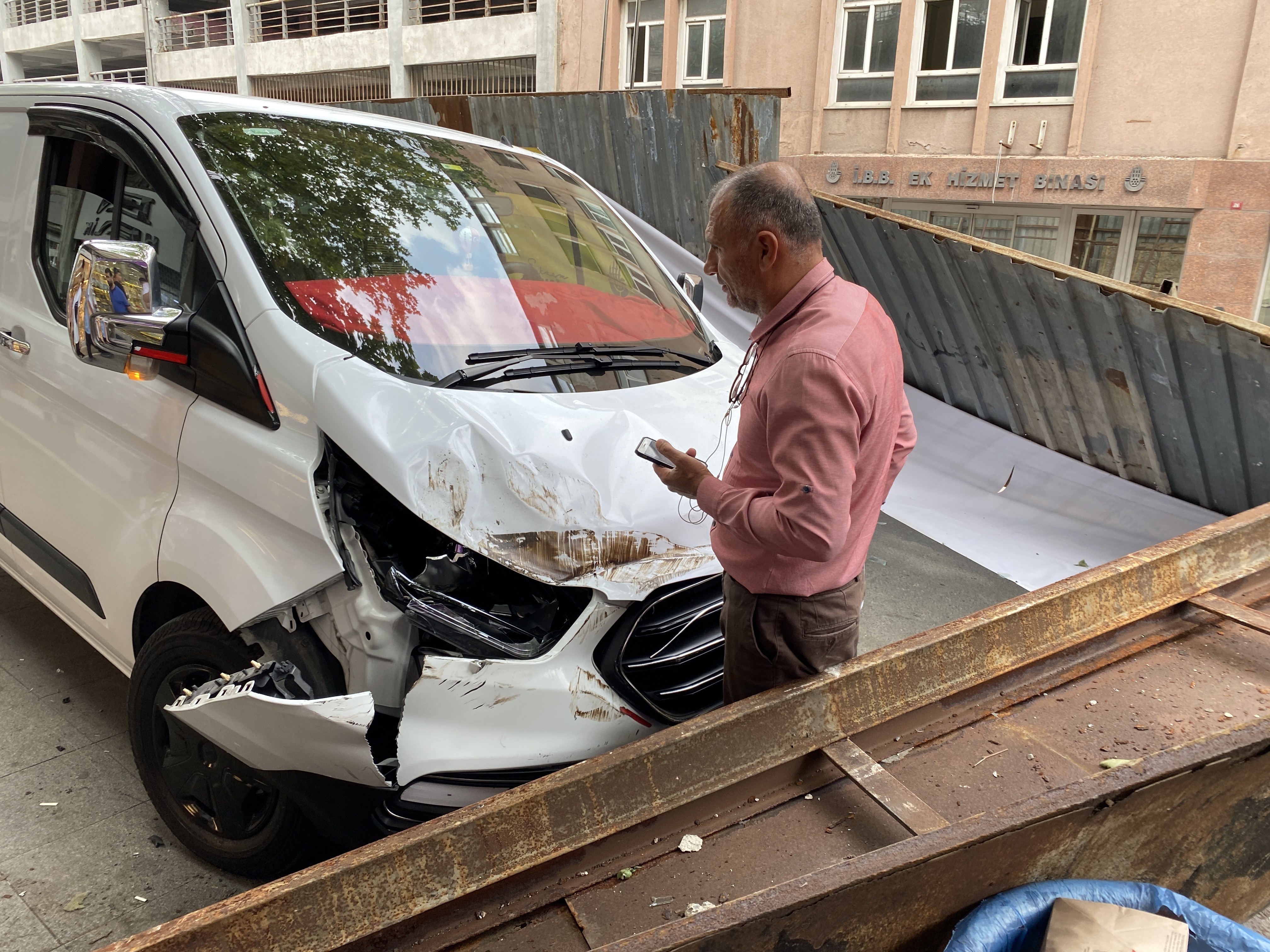 Demir parça düştüğü esnada trafikte seyir halinde olduğunu aktaran İbrahim Şıldır, “Benim aracım, ikinci araç. Yukarıdan vinç, bir kütle koparmaya çalışıyordu. Herhalde halatı koptu, direk insanların üstüne düştü. Kaç saattir ne bir zabıta, ne bir yetkili hiç kimse yok. Adamın kaşı yarıldı. Hiç kimse yok yani. Bak, millet perişan” ifadelerini kullandı.