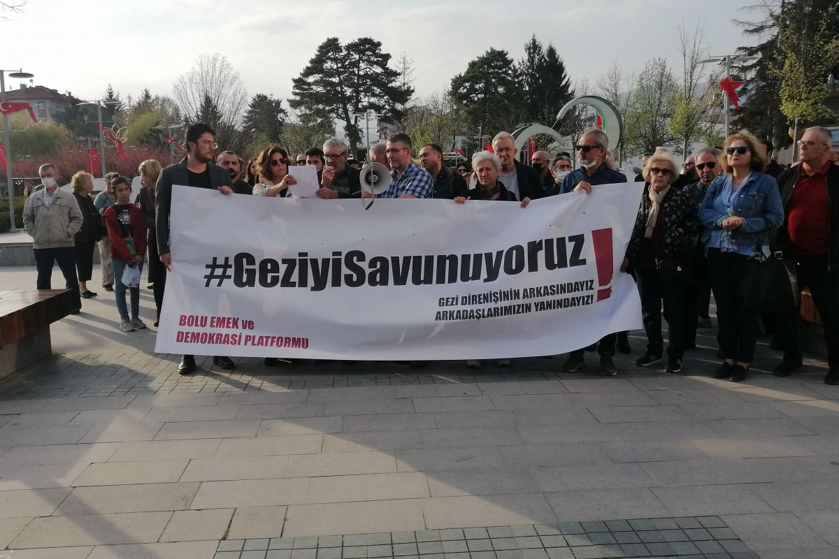 Bolu’da, Emek ve Demokrasi Platformu üyesi bir grup Gezi davası kararlarını protesto etmek amacıyla Kent Meydanı’nda bir araya geldi. Grubun basın açıklamasını yaptığı sırada elinde Türk bayrağıyla olay yerine gelen Mahmut Alam isimli şahıs sloganlar atarak Gezi davası kararlarını protesto eden gruba tepki gösterdi. Osman Kavala aleyhine sloganlar atan Alan, polis ekipleri tarafından olay yerinden uzaklaştırıldı. Geniş güvenlik önleminin alındığı basın açıklamasında grup olaysız bir şekilde dağıldı.