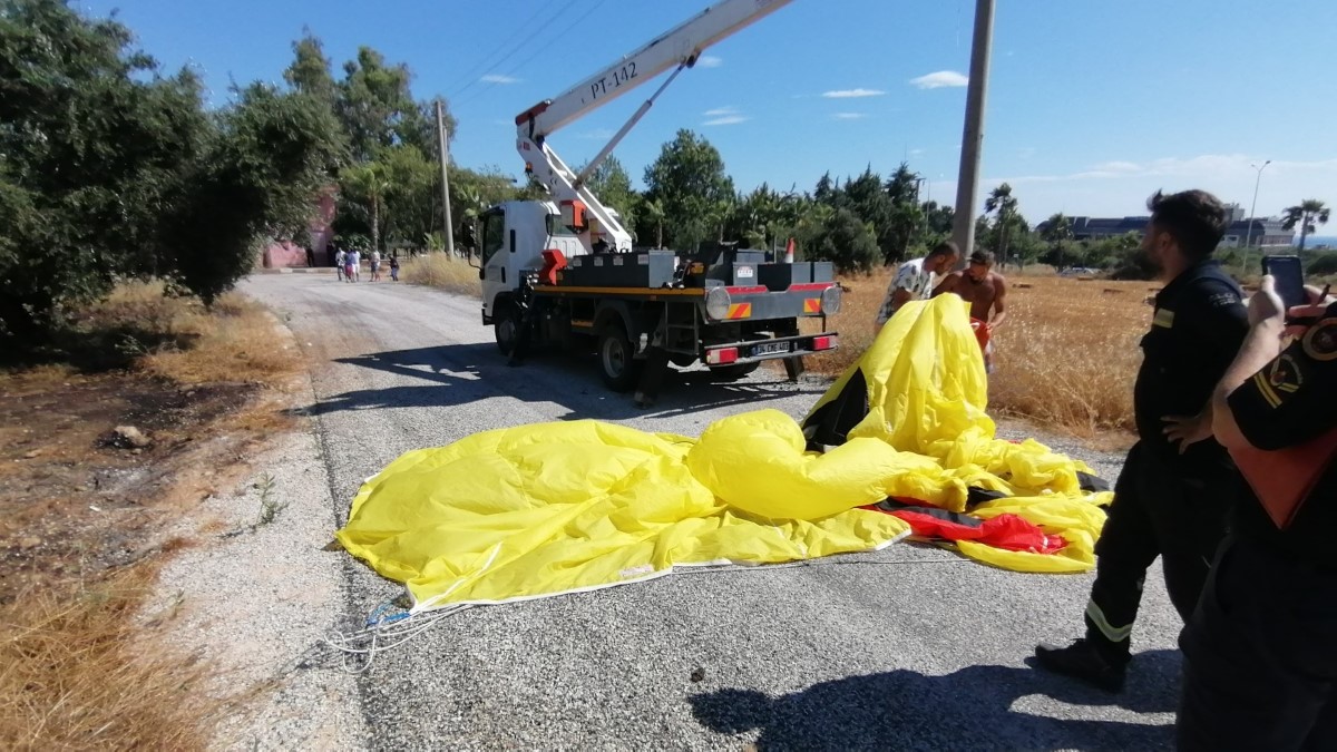 Kopan elektrik telleri zeytin bahçesinde kuru otların tutuşmasına neden olurken, Antalya Büyükşehir Belediyesi Manavgat biriminden ekiple anında müdahale ederek yangını büyümeden söndürdü. Direkte takılı kalan paraşüt, olay yerine gelen ekiplerin elektriği kesmesinin ardından bulunduğu yerden indirildi.