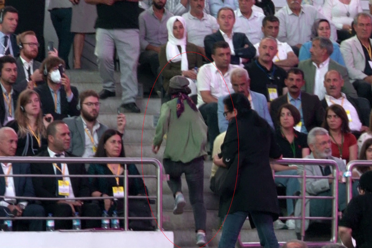 HDP 5’inci Olağan Kongresi Ankara’da yer alan Ankara Spor Salonunda gerçekleştiriliyor. Kongre esnasında HDP Eş Başkanı Pervin Buldan’ın sahnede konuşma yaptığı esnada, yüzlerini gizleyen iki kişi sahnenin önüne doğru hamle yaparak terörist başı Abdullah Öcalan’ın posterini açmaya çalıştı. Alanda yer alan görevlilerce şahıslara müdahale edilirken, yüzü bezle kapalı şahıslar posteri eline alarak tribünlere doğru koşarak uzaklaştı.