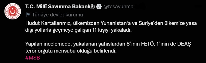 Milli Savunma Bakanlığı sosyal medya hesabından, “Hudut Kartallarımız, ülkemizden Yunanistan’a ve Suriye’den ülkemize yasa dışı yollarla geçmeye çalışan 11 kişiyi yakaladı. Yapılan incelemede, yakalanan şahıslardan 8’inin FETÖ, 1’inin de DEAŞ terör örgütü mensubu olduğu belirlendi” paylaşımında bulundu.