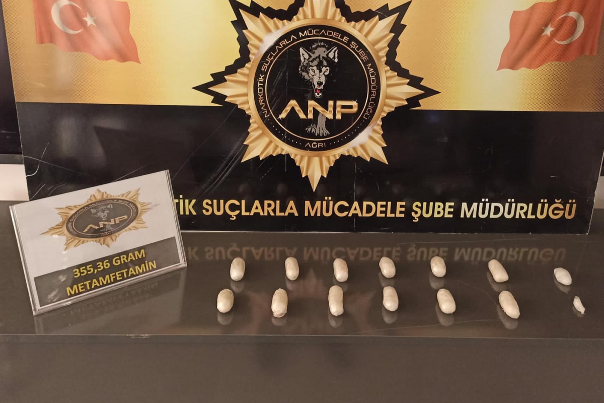 Ağrı’da, uyuşturucu veya uyarıcı madde ticareti yapan veya sağlayan kişilere yönelik yapılan çalışmalar neticesinde Bölge Trafik Uygulama Noktası’nda durdurulan 04 T 3052 plakalı araçta yolculuk eden İran uyruklu bir kişide arama yapıldı. Yapılan aramalar sonucunda, şahsın pantolonunun cep kısmında iki parça halinde şeffaf poşete sarılı vaziyette 10.17 gram gelen metamfetamin maddesi ele geçirildi. Şahsın devam eden işlemlerinde gözlerindeki kızarıklık, yemek ihtiyacı istememesi, aşırı tedirgin davranışlar sergilemesi üzerine yapılan iç beden muayenesi neticesinde röntgen vasıtasıyla makat ve bağırsak kısmında uyuşturucu kapsülleri olduğu tespit edildi. Doğal yöntemlerle şahıstan 12 adet kapsül toplam daralı ağırlığı 345.19 gram gelen metamfetamin ele geçirildi. Şahsın üzerinden ve iç bedeninden toplamda 355.36 gram uyuşturucu madde ele geçirildi.