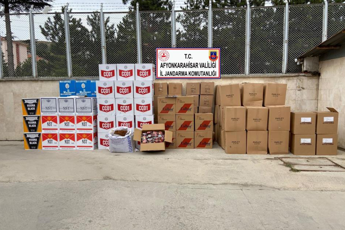 Afyonkarahisar İl Jandarma Komutanlığı ekipleri tarafından kent merkezinde ikamet eden R.A. isimli şahsın yasadışı yollarla temin ettiği kaçak sigara, tütün ve makaronları piyasaya sürerek haksız kazanç elde ettiği tespit edildi. Soruşturma dahilinde şüpheli şahsın evine baskın yapan ekipler 1 milyon 128 bin 200 adet boş makaron, 605 kilogram kaçak tütün, 33 bin 300 gram bandrolsüz açık tütün, 677 adet kullanılmış bandrol, bin 335 adet makarona basılmış kaçak sigara ve 134 adet bandrolsüz 100 gramlık paket tütün ele geçirdi.