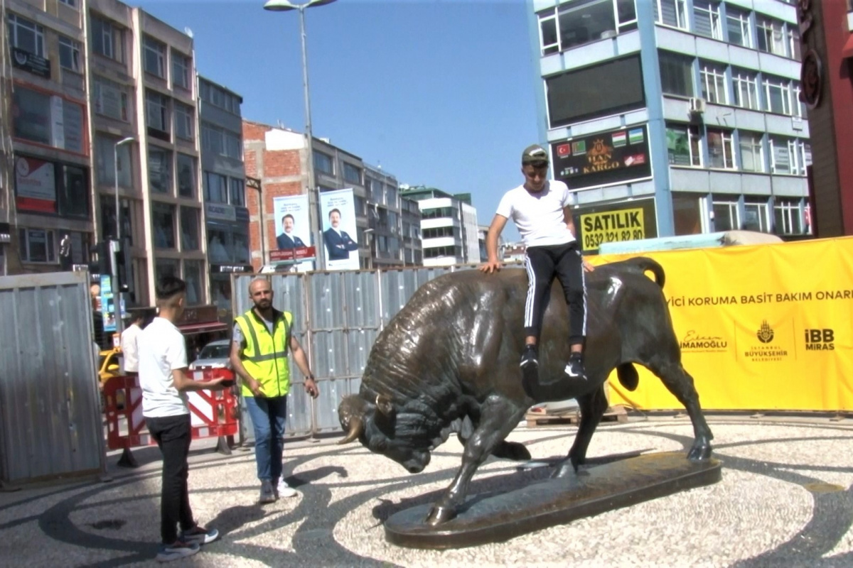Öte yandan geçtiğimiz gün çalışmalarına başlanan ve ekipler tarafında çevreye asılan uyarı yazılarına rağmen bazı vatandaşlar, bariyerleri aşarak bakım çalışması yapılan alana girdi. Boğa Heykeli üzerine çıkarak fotoğraf çektirdi. Görevlilerin durumu fark etmesi üzerine genç vatandaş, heykelden indirildi. Yaşana olayı görenler ise duruma tepki gösterdi.