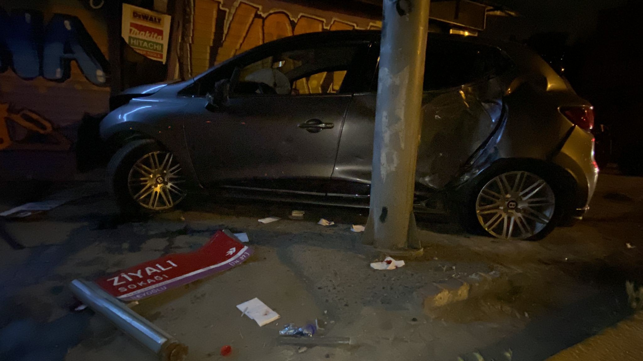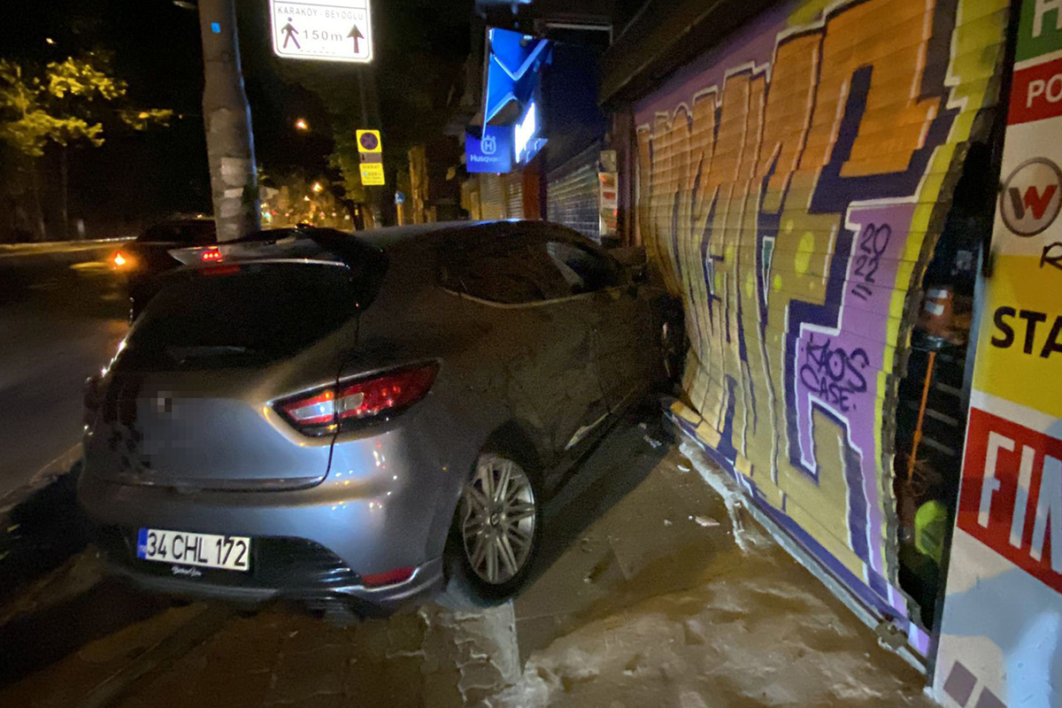 Karaköy’de kontrolden çıkan otomobil süratli şekilde sokak tabelasını ezip kepenge çarptı