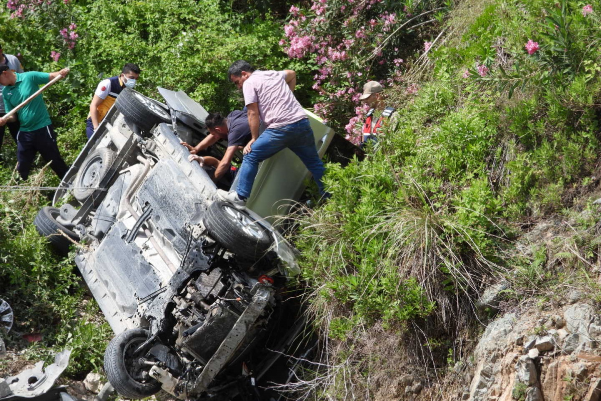 Yaralının biri otomobil içerisinde mahsur kalınca Hatay Büyükşehir Belediyesine bağlı itfaiye ekipleri halat yardımı ile otomobilde bulunan yaralıyı çıkardı.