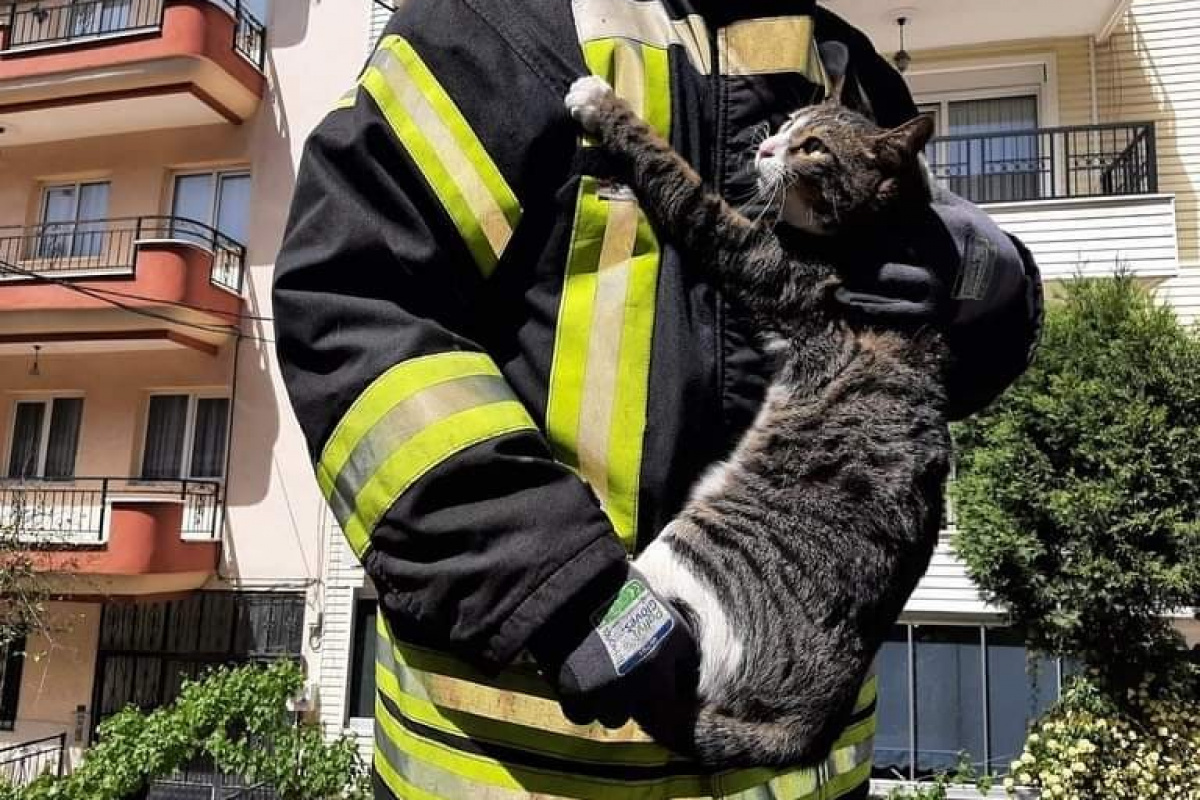 Manisa’nın Turgutlu ilçesine bağlı Cumhuriyet Mahallesi Mektep Sokak’taki 4 katlı bir apartmanın ikinci katında mahsur kalan kediyi gören vatandaşlar durumu itfaiye ekiplerine bildirdi. Haber verilmesiyle olay yerine gelen Manisa Büyükşehir Belediyesine bağlı itfaiye ekipleri mahsur kalan kediyi kurtarmak için çalışma başlattı. Merdivenli araç yardımıyla kurtarılan kedinin oldukça korktuğu dikkat çekerken, kendisini kurtaran itfaiye erinin kucağından inmedi. Uzun süre itfaiye erinin kucağında kalan kedi sağlık kontrolleri yapıldıktan sonra yeniden sokağa salındı. Mahalle sakinleri itfaiye ekiplerine teşekkür etti.