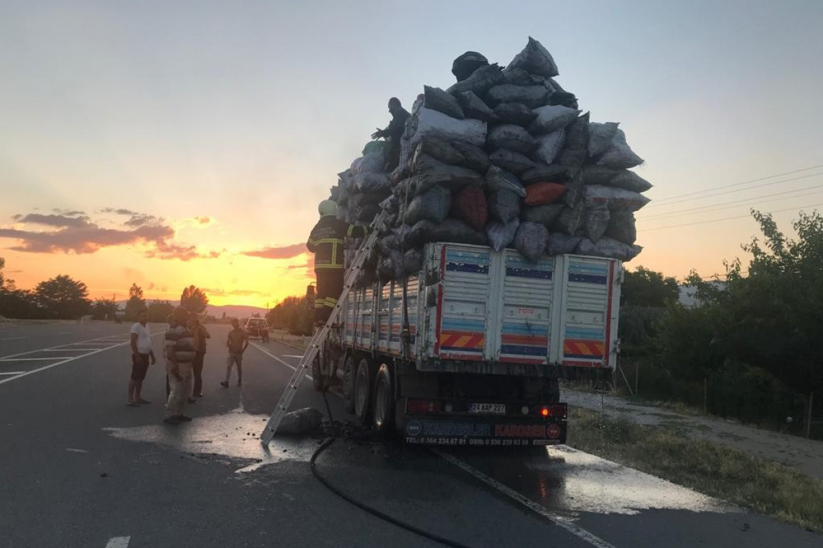 Mangal kömürü yüklü tırda çıkan yangını itfaiye söndürdü
