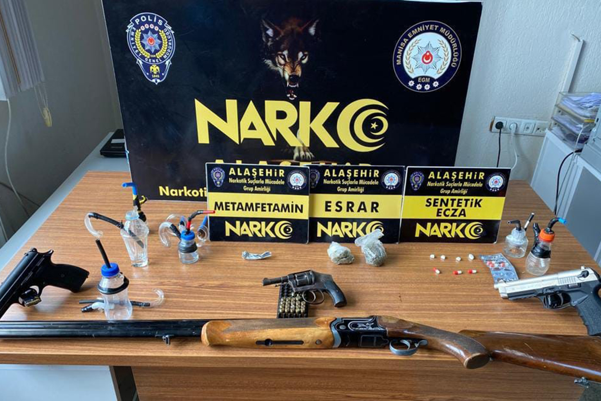 Manisa İl Emniyet Müdürlüğü Narkotik Suçlarla Mücadele Şube Müdürlüğü ve Alaşehir Narkotik Suçlarla Mücadele Grup Amirliği görevlilerince uyuşturucu veya uyarıcı madde ticareti yapan, nakleden ve kullanan şahıslara yönelik yapılan çalışmalarda Alaşehir ilçesinde 8 ikamet adresinde aramalar yapıldı. Yapılan aramalarda; 16,70 gram esrar maddesi, 2,13 gram metamfetamin maddesi, 6 adet sentetik ecza hapı, 3 adet extacy hap, 8 adet uyuşturucu madde kullanmaya yarayan aparat, 3 adet ruhsatsız tabanca, 1 adet ruhsatsız av tüfeği, 19 adet 9 mm fişek ve 3 adet 7.65 mm fişek ele geçirildi. Yapılan çalışma sonunda 9 şüpheli şahıs yakalanarak gözaltına alındı. Gözaltına alınan şüphelilerin emniyetteki işlemlerinin devam ettiği öğrenildi.