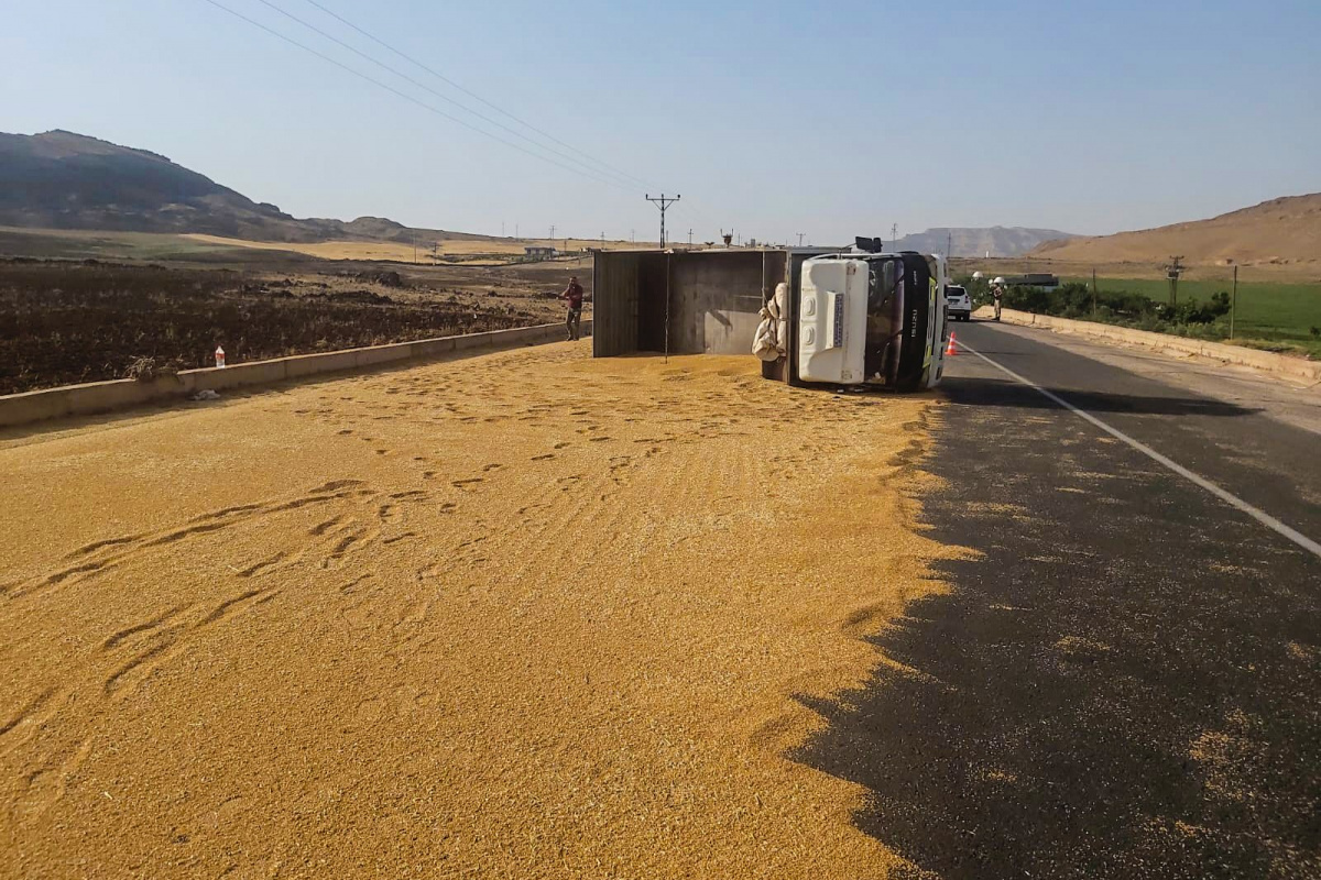 Mardin’de kamyon devrildi, tonlarca buğday yola döküldü