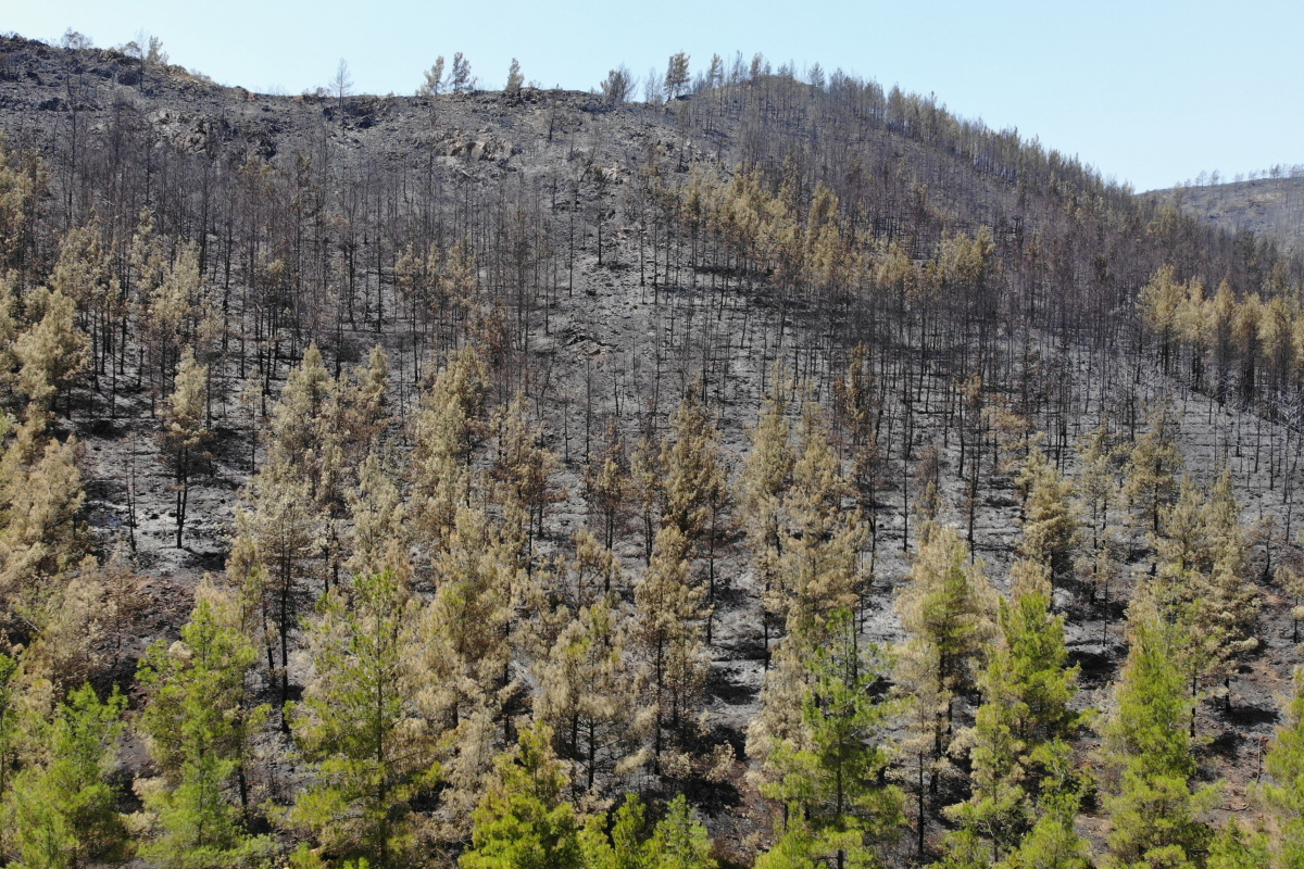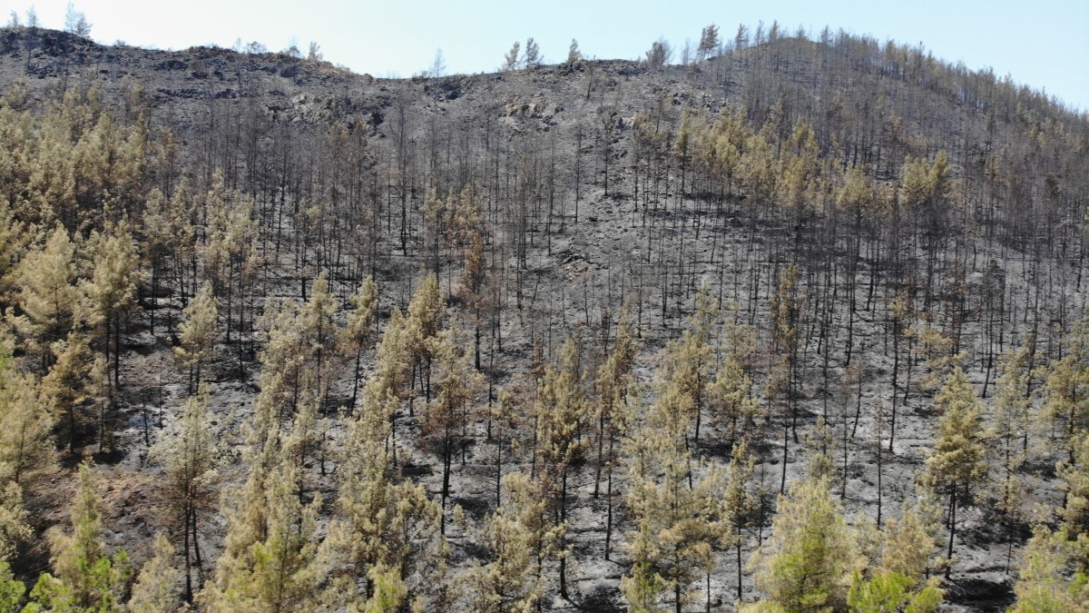 Muğla’nın Marmaris ilçesinde süren orman yangınında durum iyiye giderken, alevlerin söndürüldüğü alanlar dron ile havadan görüntülendi. Değirmenyanı mevkiinde alevlere teslim olan ağaçların kömüre dönüştüğü görülürken, yangın ise geride gri bir kül tabakası bıraktı.
