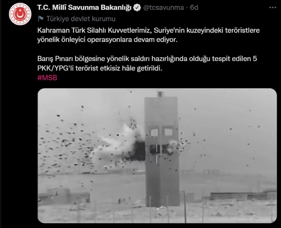 Milli Savunma Bakanlığı sosyal medya hesabında, “Kahraman Türk Silahlı Kuvvetlerimiz, Suriye’nin kuzeyindeki teröristlere yönelik önleyici operasyonlara devam ediyor. Barış Pınarı bölgesine yönelik saldırı hazırlığında olduğu tespit edilen 5 PKK/YPG’li terörist etkisiz hâle getirildi” paylaşımında bulundu.