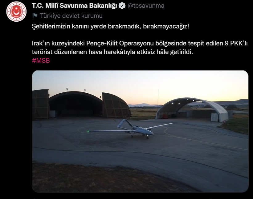 Milli Savunma Bakanlığı sosyal medya hesabından, “Şehitlerimizin kanını yerde bırakmadık, bırakmayacağız! Irak’ın kuzeyindeki Pençe-Kilit Operasyonu bölgesinde tespit edilen 9 PKK’lı terörist düzenlenen hava harekâtıyla etkisiz hâle getirildi” paylaşımında bulundu.