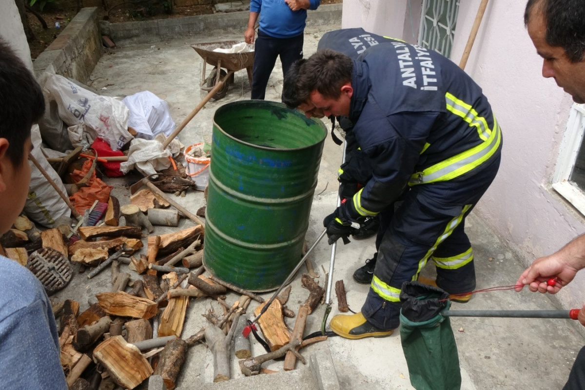 Şelale Mahallesi 3540 sokak adresinden gelen yılan ihbarına giden itfaiye ekibi, Musa Şenol isimli vatandaşa ait ikametin önünde bulunan odunluktaki yılanı ararken sıcak havanında etkisiyle zor anlar yaşadı. Çocukların ve vatandaşların heyecanlı bekleyişi arasında odunluktaki tüm odunları dışarı çıkaran ve aktaran itfaiye görevlileri, yılanı bulduktan sonra bu kez de yakalamak için çaba harcadı.