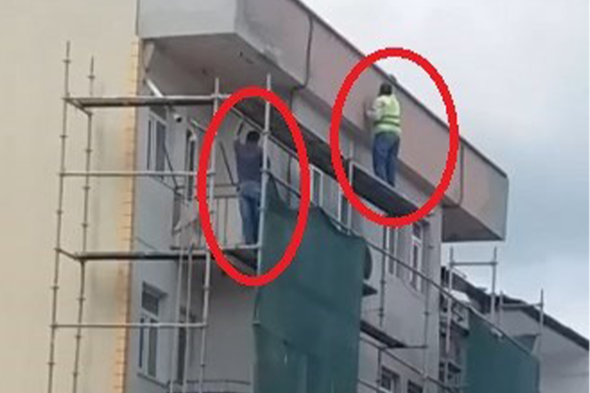 Dün öğle saatlerinde iş güvenliği almadan iskelede çalışan işçilerin ölümle dans ettiği o anlar cep telefonuyla kaydedilmişti. İşçiler çevredeki vatandaşlar tarafından uyarılmasına rağmen hiçbir tedbir alınmadı. Aynı işçiler bir gün sonra çalıştıkları iskeleden düştü. İşçilerden biri apartman girişinde bulunan işyerinin tabelasına tutunarak yere çakılmaktan kurtuldu.