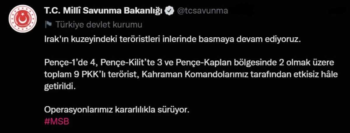 Milli Savunma Bakanlığı sosyal medya hesabından, “Irak’ın kuzeyindeki teröristleri inlerinde basmaya devam ediyoruz. Pençe-1’de 4, Pençe-Kilit’te 3 ve Pençe-Kaplan bölgesinde 2 olmak üzere toplam 9 PKK’lı terörist, Kahraman Komandolarımız tarafından etkisiz hâle getirildi. Operasyonlarımız kararlılıkla sürüyor” paylaşımında bulundu.