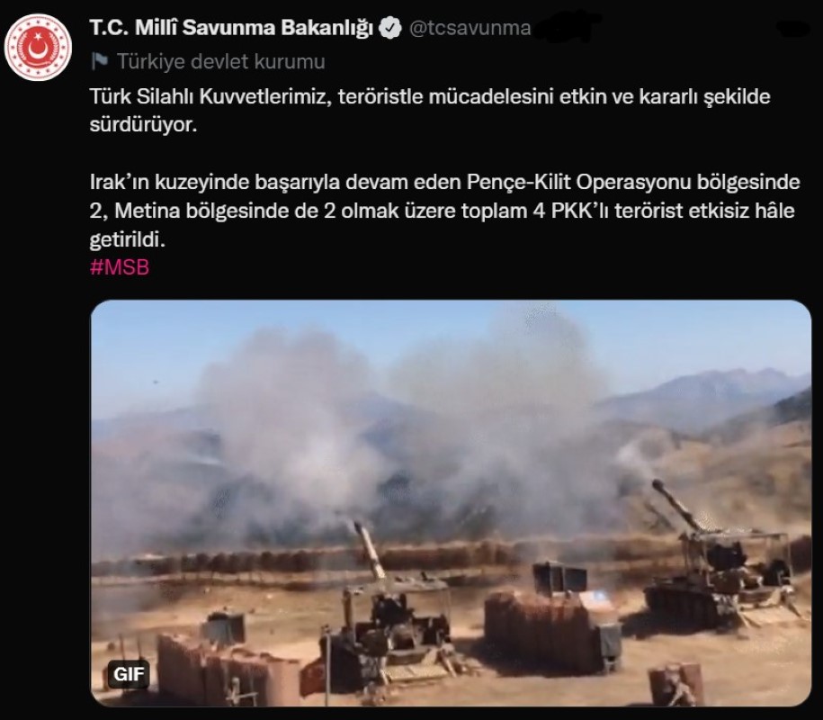 Milli Savunma Bakanlığı sosyal medya hesabından, “Türk Silahlı Kuvvetlerimiz, teröristle mücadelesini etkin ve kararlı şekilde sürdürüyor. Irak’ın kuzeyinde başarıyla devam eden Pençe-Kilit Operasyonu bölgesinde 2, Metina bölgesinde de 2 olmak üzere toplam 4 PKK’lı terörist etkisiz hâle getirildi” paylaşımında bulundu.