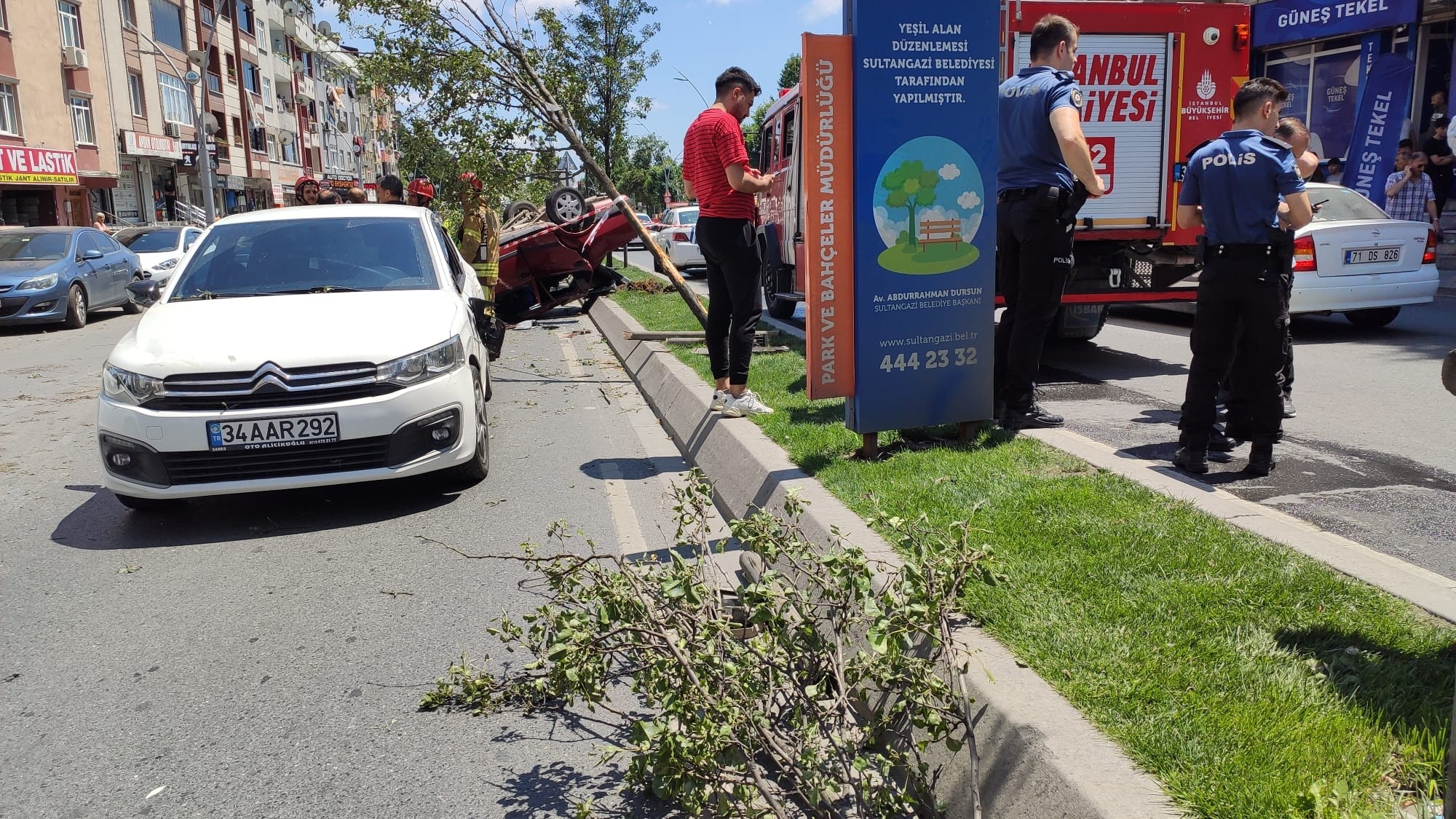 Olay saat 14.00 sıralarında Sultangazi Hoca Ahmet Yesevi Bulvarı üzerinde meydana geldi. İddiaya göre, Uğurmumcu Mahallesi’nden Küçükköy istikametine 77 AAP 640 plakalı otomobille ilerleyen ehliyetsiz genç, drift yaparken aracın kontrolünü kaybetti. İçinde sürücüyle birlikte 4 gencin bulunduğu otomobil takla atıp önce refüje ardından ağaca çarptı. Karşı şeride geçen araç, içerisinde 1’i çocuk 4 kişinin bulunduğu Muhittin Karagöz idaresindeki 34 AAR 292 plakalı otomobile çarptı. İhbar üzerine olay yerine polis, itfaiye ve sağlık ekipleri sevk edildi. Olay yerine gelen itfaiye ekipleri araçta yakıt sızıntısı olduğu için güvenlik önlemi alırken, vatandaşlar ise çevrede sigara içmemeleri konusunda uyarıldı. Kazada ölen ya da yaralanan olmazken, her iki araçta da hasar oluştu.