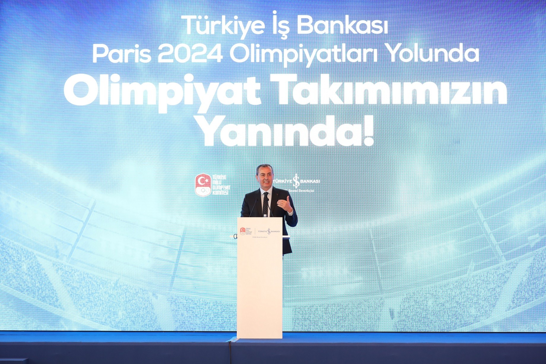İş Bankası Genel Müdürü Hakan Aran, düzenlenen basın toplantısında yaptığı konuşmada, “İnanıyorum ki Türkiye Milli Olimpiyat Komitesi ile beraber yürüyeceğimiz bu yolculukta hepimizi gururlandıracak, sevindirecek başarılara birlikte imza atacağız. Bu başarılar, sadece skorla veya madalyayla ölçülmeyecek. Çünkü biz gençlerimizin yeniden hayal kurabilmesi, gençlerimize örnek olacak yeni rol modeller yetişmesi için bu anlamlı yola çıkıyoruz. Bu güç birliği sayesinde önümüzde olimpiyat rüzgârının eseceği 3 yıllık güzel bir dönem bizleri bekliyor” dedi.