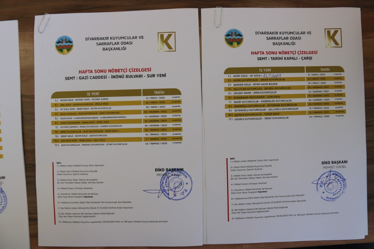 Diyarbakır Kuyumcular ve Sarraflar Odası Başkanı (DİKO) Mehmet Yüksel ve ekibi, oda olarak kuyumcu sektörü ve kent için belirledikleri projeleri hayata geçirmeye başladı. Tarihi ile turizmin gözdesi olan Diyarbakır’a yoğun turist gelmesiyle birlikte Türkiye’de bir ilk yapılarak “Nöbetçi kuyumcu” sistemi başlatıldı.