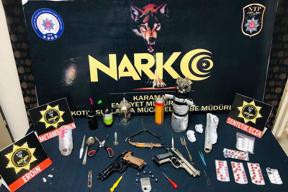 Operasyonda şüphelilerin evlerinde yapılan aramalarda da 50 gram esrar, 100 gram metamfetamin, 15 gram bonzai, 377 adet reçeteye tabi hap, 5 adet payp tabir edilen aparat 1 adet hassas terazi, 3 adet bıçak ve 2 adet kuru sıkı tabanca ele geçirildi.