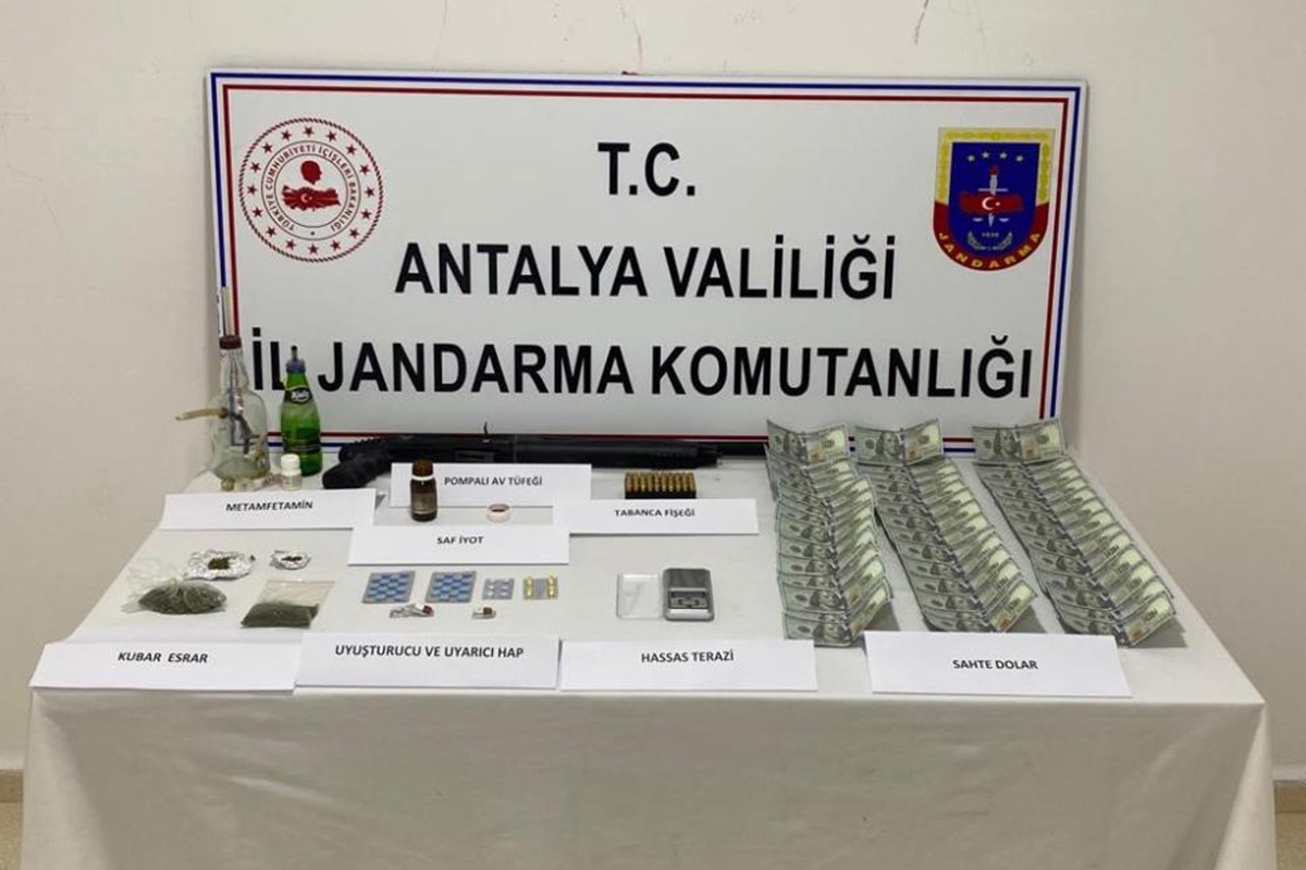 Manavgat Cumhuriyet Başsavcılığı koordinesinde Antalya İl Jandarma Komutanlığı Asayiş Şube Müdürlüğü JASAT Timleri, Manavgat İlçe Jandarma Komutanlığı KOM ve Merkez Karakoluna bağlı ekipler tarafından şüphelinin Bahçelievler Mahallesindeki evinde yapılan aramada; 5 parça halinde toplam 21 gram esrar uyuşturucu maddesi, 100 gram metamfetamin imalatında kullanılan ana etken maddesi saf iyot, 48 adet uyuşturucu/uyarıcı hap, 1 gram metamfetamin uyuşturucu maddesi, 1 adet uyuşturucu satışında kullanılan hassas terazi, 13 adet uyuşturucu satışında kullanılacak boş ambalaj, 4 adet uyuşturucu madde kullanma aparatı payp, 42 adet sahte 100 dolarlık banknot, 50 adet 9 milimetre tabanca fişeği ve 1 adet ruhsatsız pompalı av tüfeği ele geçirildi.