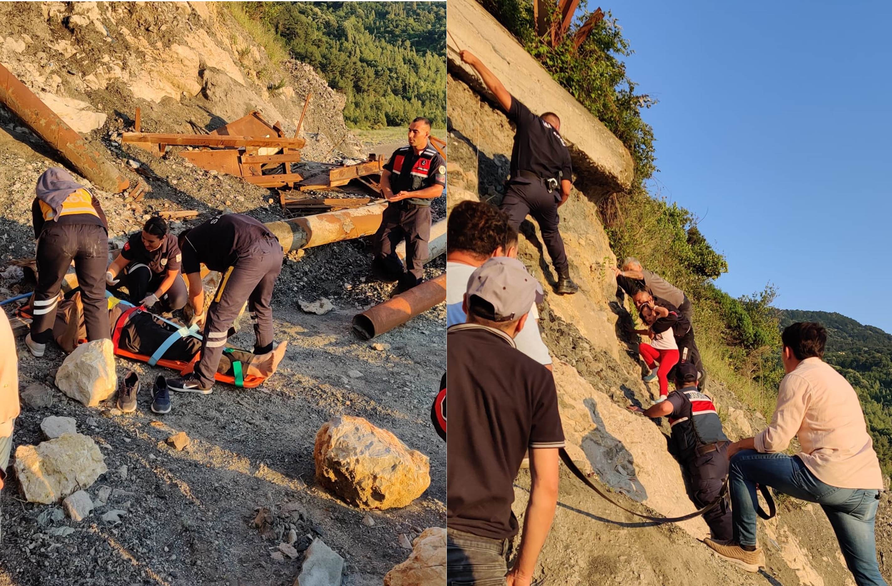Kayalıklarda mahsur kalan küçük kız halat yardımıyla güvenli bölgeye indirilirken yeğenine ulaşmak isterken düşüp yaralanan dayı ise sedyeye alınıp olay yerindeki ilk müdahalesinin ardından ambulansa taşındı.